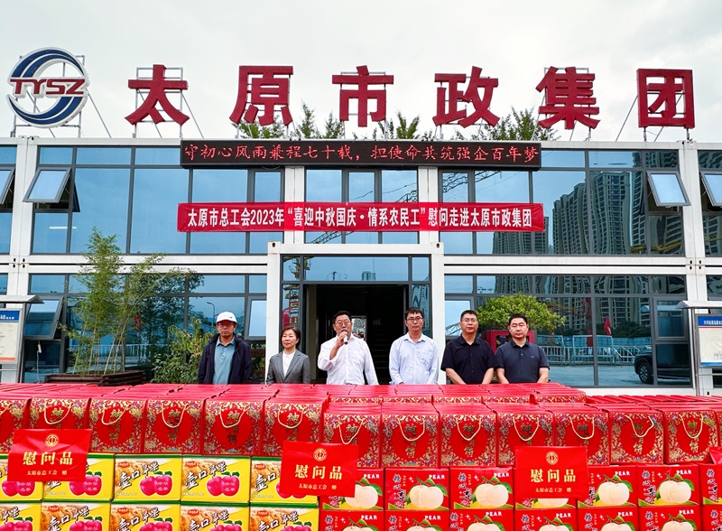 9月19日下午,太原市總工會(huì)黨組書記、副主席汪倫,太原市政府農(nóng)民工辦公室科長(zhǎng)任俊峰一行來到集團(tuán)公司興華街周邊排水系統(tǒng)及道路園林景觀提標(biāo)改造工程二標(biāo)段施工現(xiàn)場(chǎng)開展“喜迎中秋國(guó)慶·情系農(nóng)民工”慰問活動(dòng),送來月餅、豬肉、水果等慰問品。太原市市政公共設(shè)施建設(shè)管理中心興華街項(xiàng)目負(fù)責(zé)人牛瑞浩,集團(tuán)公司黨委委員、紀(jì)委書記李茁,黨委委員、監(jiān)事會(huì)主席、工會(huì)主席馮忠參加了活動(dòng)。