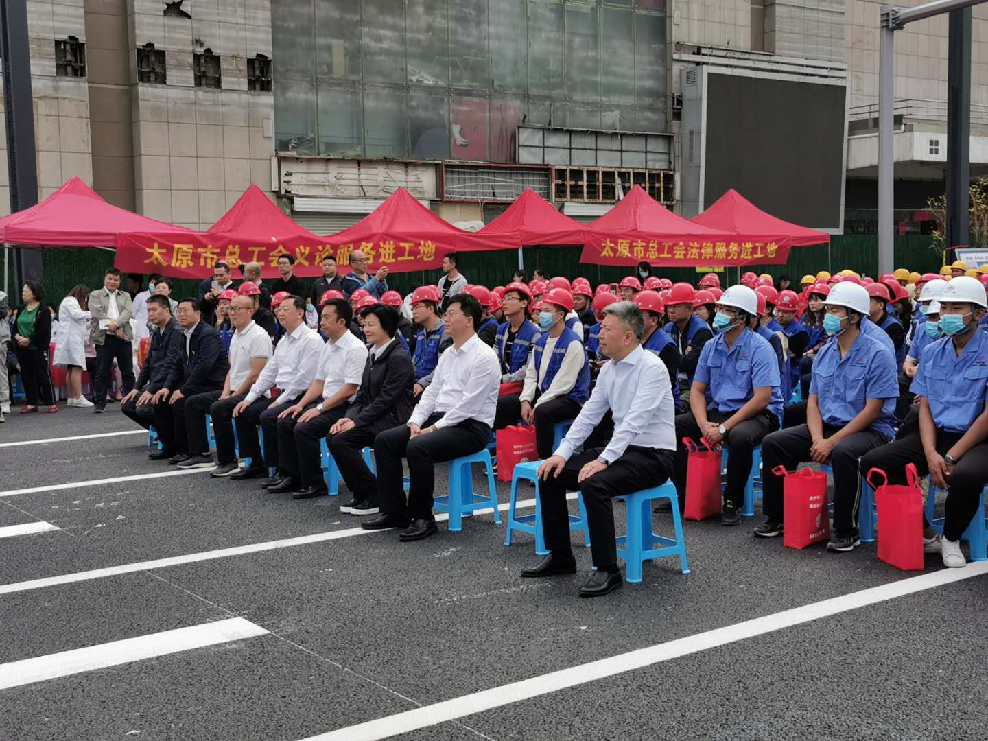 本次活動包括送關(guān)愛、送健康、送法律、送文化、送文明。活動中,市愛爾眼科醫(yī)院、市婦幼保健院等六家單位為參建人員及農(nóng)民工提供醫(yī)療義診和免費的法律援助服務(wù)。市總工會黨組書記、常務(wù)副主席薛之東代表太原市委、市總工會、市人社局向參加此次活動的農(nóng)民工表示最衷心的感謝和最熱烈的歡迎。解放路改造工程二標段農(nóng)民工代表向全市百萬職工發(fā)出了“爭做文明太原人建設(shè)錦繡太原城”倡議書,號召大家都行動起來,繼續(xù)發(fā)揚創(chuàng)城精神和干勁,為再現(xiàn)“錦繡太原城”盛景貢獻力量。同時,領(lǐng)導們?yōu)樘薪夥怕犯脑旃こ痰膮⒔ㄈ藛T發(fā)放了月餅、口罩等慰問品?!包h的理論創(chuàng)新”文藝小分隊進行了文藝演出。