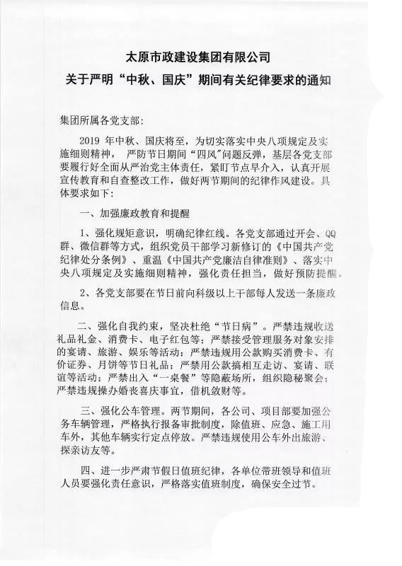 太原市政建設集團有限公司關(guān)于嚴明“中秋、國慶”期間有關(guān)紀律要求的通知