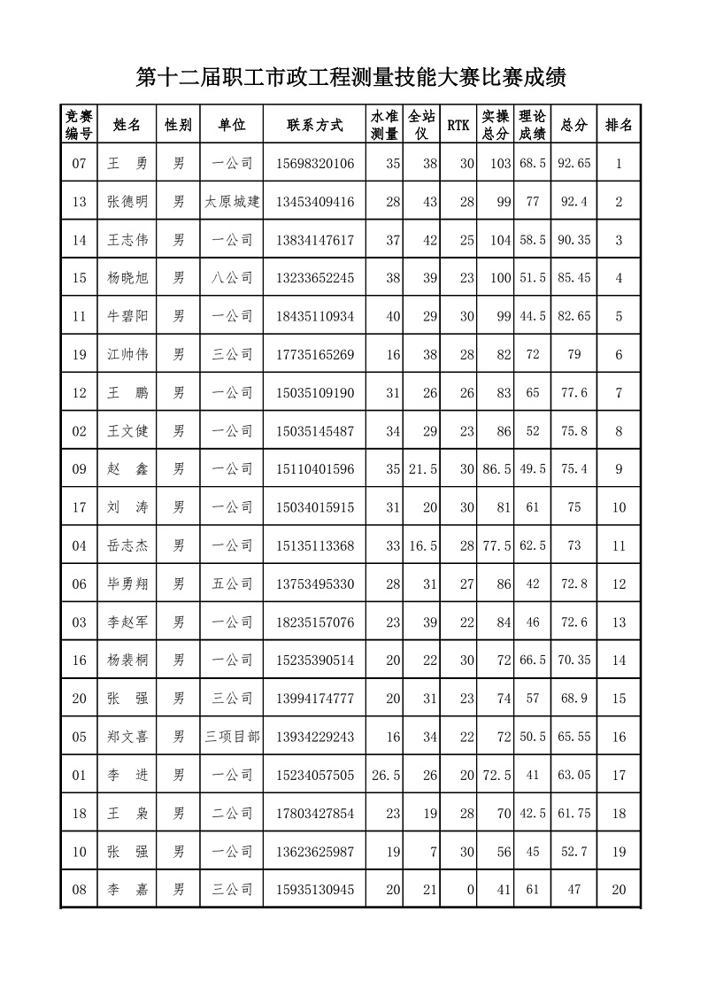 又訊:本屆市政工程測(cè)量放線員技能大賽,共有94名選手報(bào)名參賽,大賽分為理論和實(shí)操兩部分。理論考試獲得前20名的選手進(jìn)入實(shí)際操作比賽。經(jīng)過一天的角逐,裁判組根據(jù)選手現(xiàn)場(chǎng)操作情況進(jìn)行綜合評(píng)判、打分。每位選手最終成績(jī)由30%的理論成績(jī)和70%的實(shí)操成績(jī)組成,最終決出前16名,其中榮獲前6名的選手將報(bào)請(qǐng)市勞動(dòng)競(jìng)賽委員會(huì)給予記功表彰,7-16名的選手頒發(fā)“優(yōu)秀選手”榮譽(yù)證書。