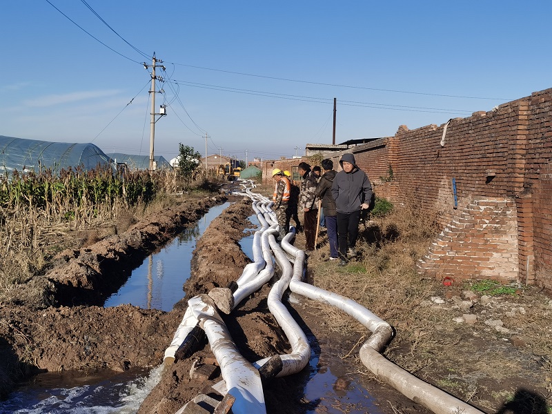 由于該村緊鄰象峪河,因河道水位持續(xù)高漲,村內(nèi)積水無法自然排出,導(dǎo)致近98萬平方米耕地被淹,總積水量約為60萬立方米。搶險突擊隊以里旺村小區(qū)西側(cè)耕地最低點為起點,呈樹枝狀布置水泵,以村莊東處的象峪河為排水末端,通過最低點水泵提升、中端水泵轉(zhuǎn)輸、末端水泵強排的三級聯(lián)排,并利用地形高差、開溝槽下管引流等方式降低耕地整體水位。經(jīng)過六天的晝夜奮戰(zhàn),截止10月18日晚,抽排積水約17萬立方米,積水面消退約15萬平方米,疏導(dǎo)退水渠約1400米。