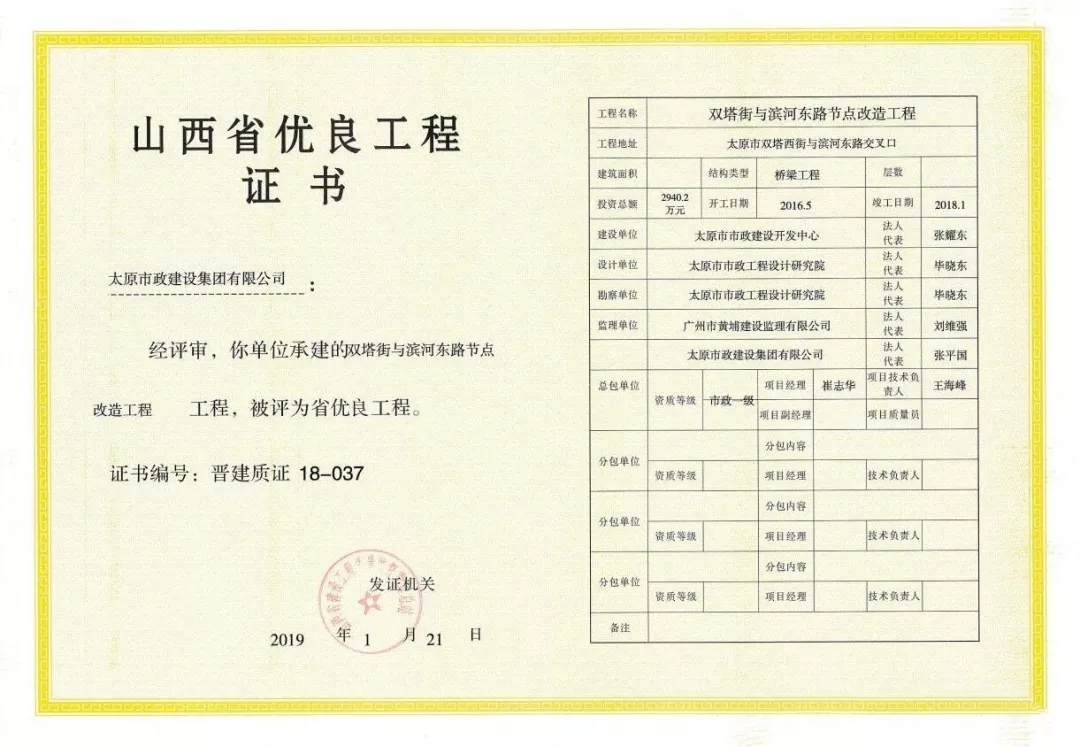 太原市政建設(shè)集團(tuán)有限公司雙塔街與濱河?xùn)|路節(jié)點改造工程榮獲“山西省優(yōu)良工程”榮譽稱號