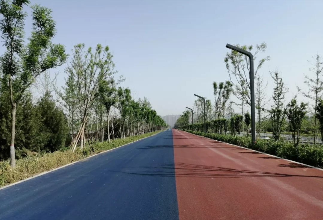 在道路鋪設(shè)過程中,為契合“二青”會體育精神,項目部在該工程面層鋪設(shè)彩色瀝青,不僅使路面更加干凈美觀,也為場館周邊道路增添一抹運動色彩。由于東大堤頂涉及國際自行車賽道,項目部制定可行性方案,在1、2號出入口施工中,采用墻端倒圓角處理,確保交通安全順暢。工程建設(shè)中,項目部全體參建人員不忘初心,堅守使命,以熱情燃燒“卡路里”,助力品質(zhì)工程建設(shè)。