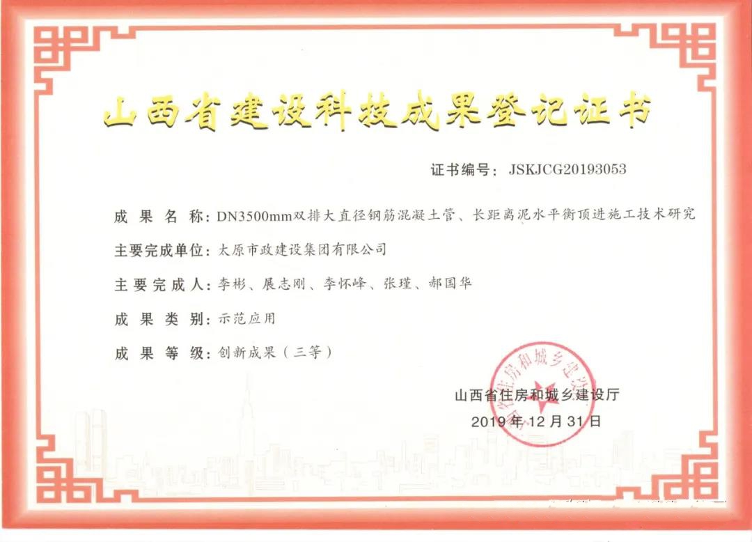 近日,集團(tuán)公司申報(bào)的《DND3500mm雙排大直徑鋼筋混凝土管、長(zhǎng)距離泥水平衡頂進(jìn)施工技術(shù)研究》被山西省住房和城鄉(xiāng)建設(shè)廳評(píng)為創(chuàng)新成果(三等)。