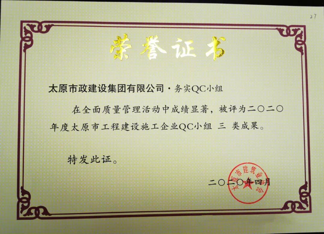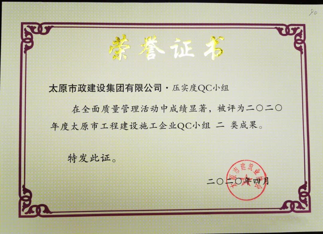 4月10日,集團(tuán)公司壓實(shí)度QC小組的《濕陷性粉土壓實(shí)度控制》,被太原市建筑施工協(xié)會(huì)評(píng)為2020年度太原市工程建設(shè)施工企業(yè) QC小組二類成果;集團(tuán)公司務(wù)實(shí)QC小組的《提高檢查井旁人行道磚的觀感質(zhì)量》,被太原市建筑施工協(xié)會(huì)評(píng)為2020年度太原市工程建設(shè)施工企業(yè) QC小組三類成果。