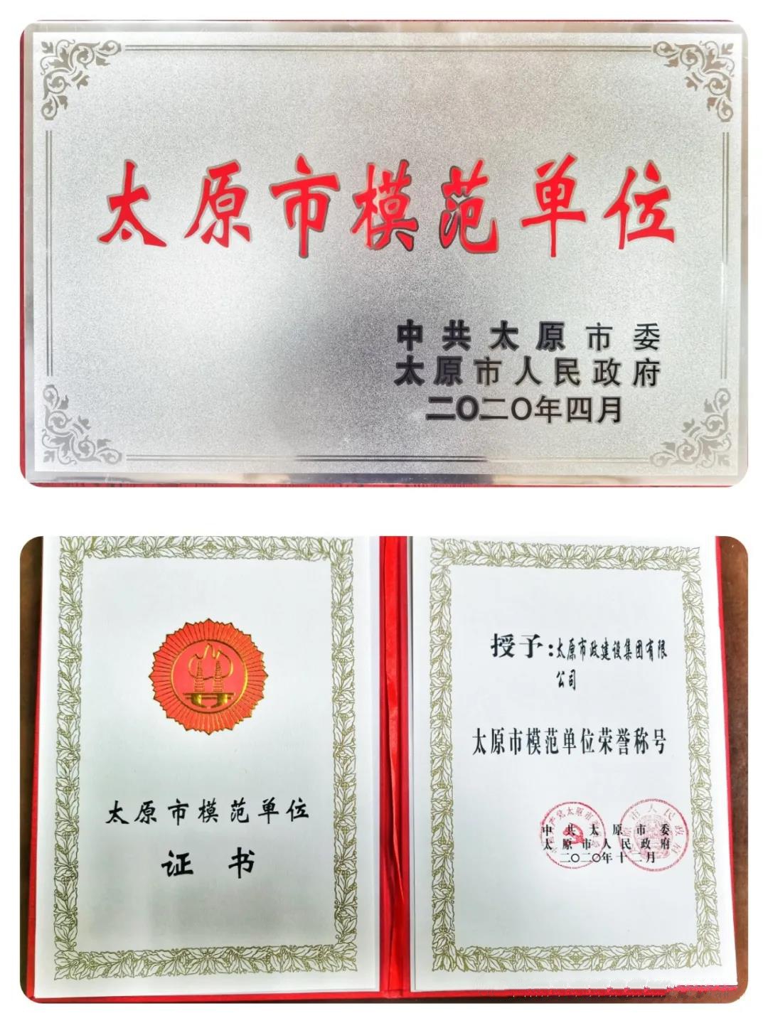 集團(tuán)公司被市委、市政府授予“太原市模范單位”榮譽(yù)稱號(hào);聚興勞務(wù)公司王留金榮獲太原市“特級(jí)勞動(dòng)模范”榮譽(yù)稱號(hào);一公司張棟超榮獲太原市“勞動(dòng)模范”榮譽(yù)稱號(hào);二公司王天榮、郝紅勝被命名為“晉陽工匠”榮譽(yù)稱號(hào);一公司汾東污水處理廠及配套管網(wǎng)一期二步工程項(xiàng)目部、二公司火車南站西廣場導(dǎo)改工程項(xiàng)目部和聚興勞務(wù)公司孫瑞臣勞務(wù)隊(duì)被授予太原市“工人先鋒號(hào)”榮譽(yù)稱號(hào)。