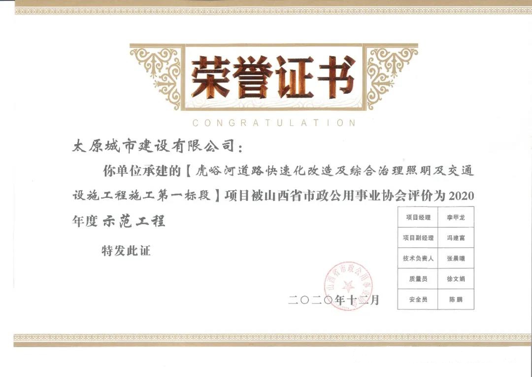 近日,太原城建公司承建的虎峪河道路快速化改造及綜合治理照明及交通設(shè)施工程施工一標段被山西省市政公用事業(yè)協(xié)會評為“2020年度示范工程”。李甲龍在2020年度山西省市政公用事業(yè)協(xié)會市政工程項目經(jīng)理評價活動中被評為“優(yōu)秀項目經(jīng)理”。