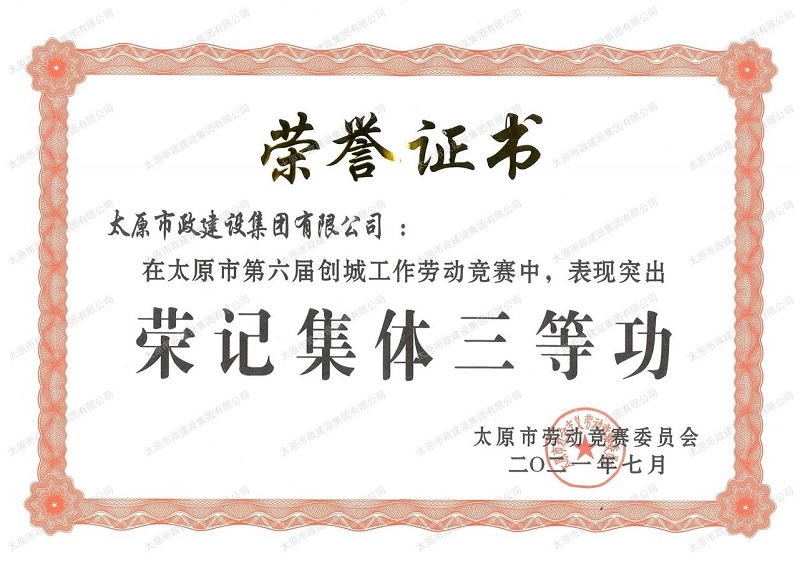 太原市第六屆創(chuàng)城工作勞動競賽集體三等功榮譽證書